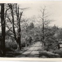 Black and white photograph of the road from Mendham Road to the Willows. Also known as the "road to Jacob Arnold's." Dirt road through the trees. Fosterfields Farmhouse and Creamery visible on the right side. 1 original, 6 black and white copies (three cropped and zoomed) 4 negatives |